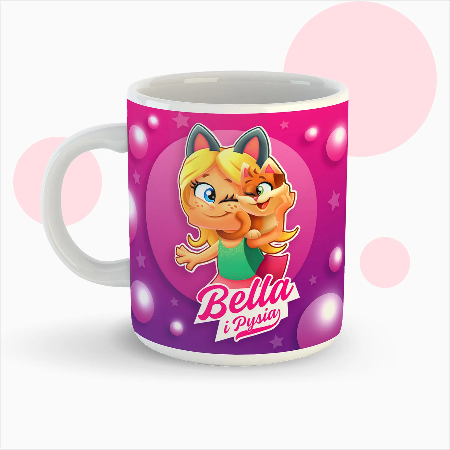 Przed Wami kubek dla największych fanek Belli! Jego pojemność wynosi 330 ml, a na białej powierzchni widnieje nowy Belli z Pysią. Mamy nadzieję, że będzie Ci długo służył!