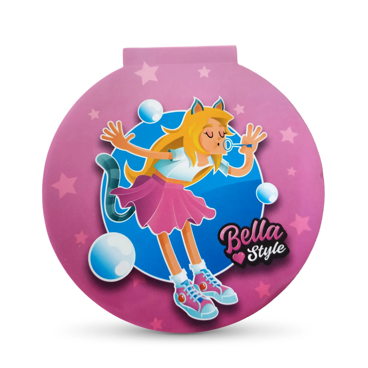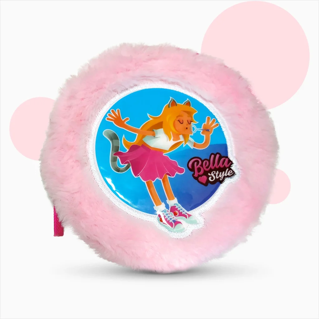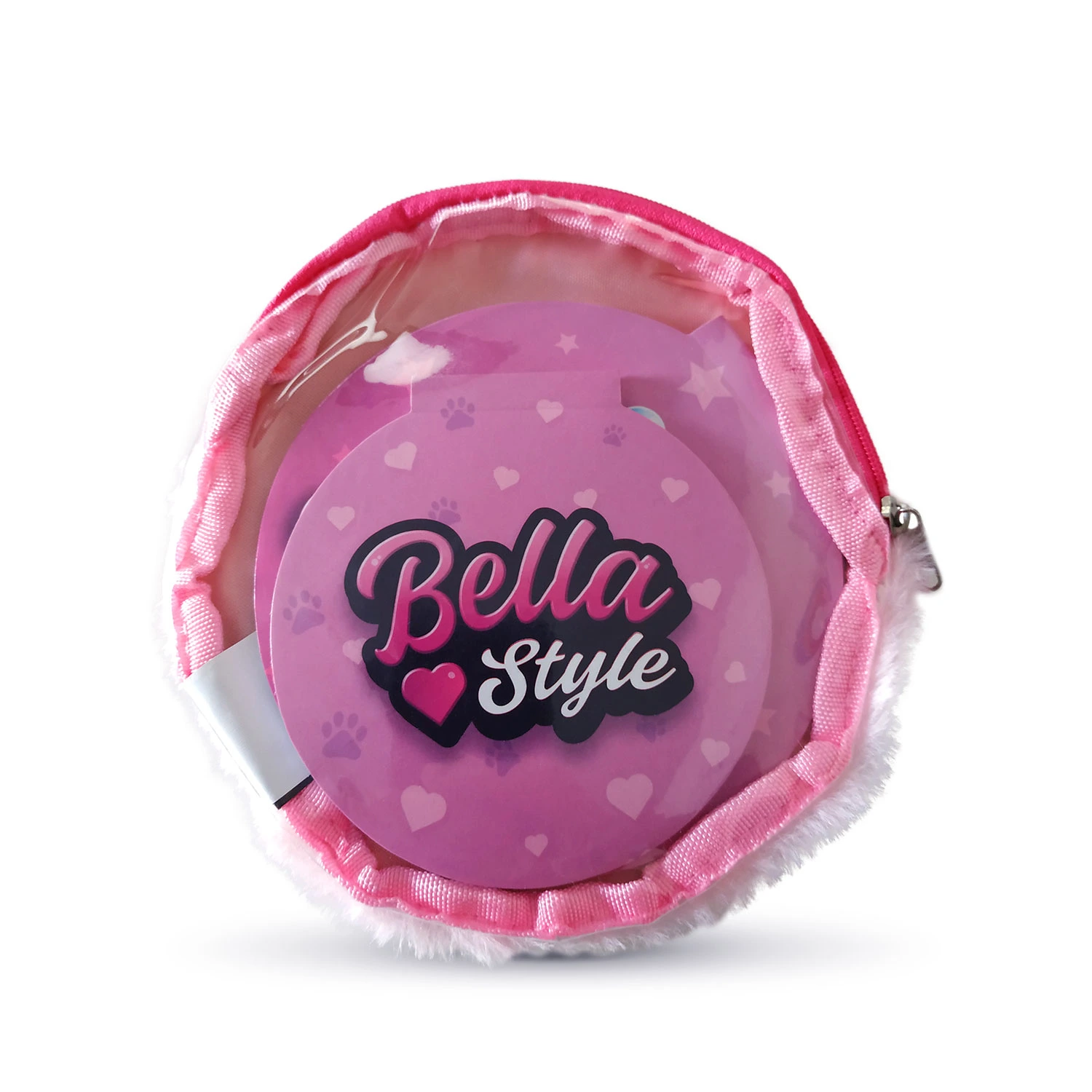 Okrągła, pluszowa saszetka, tył wykonany z transparentnego PVC. W zestawie 2 notesiki (30 kartek) w kształcie saszetki. Rozmiar 13×13 cm.